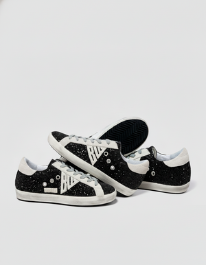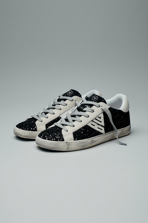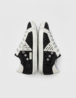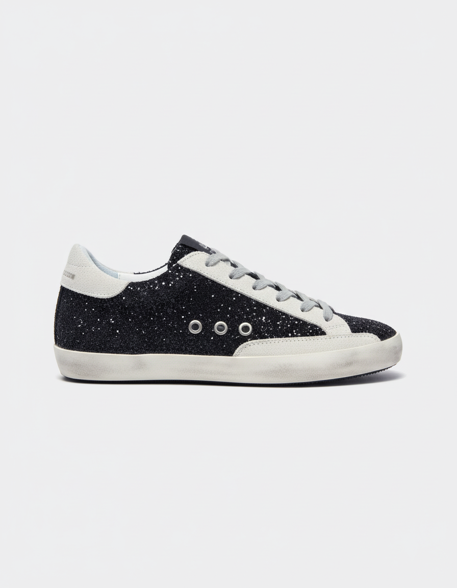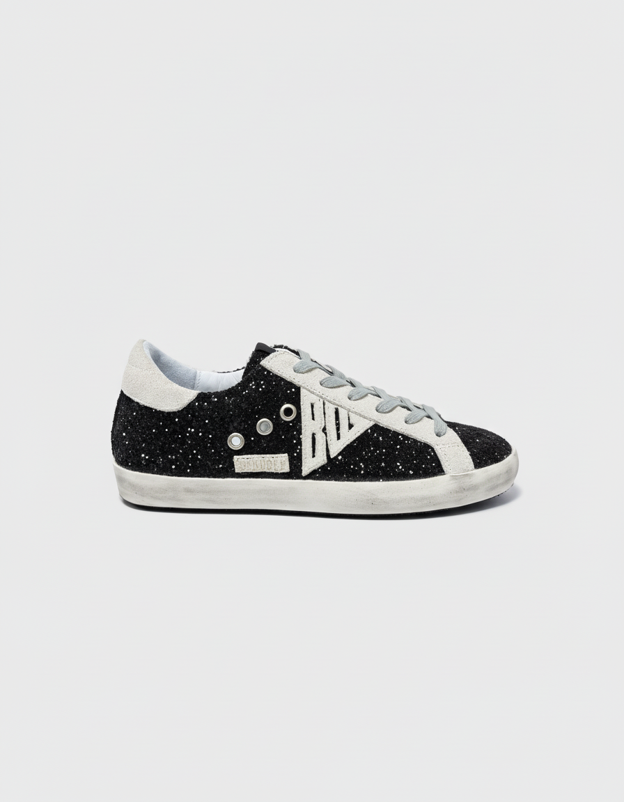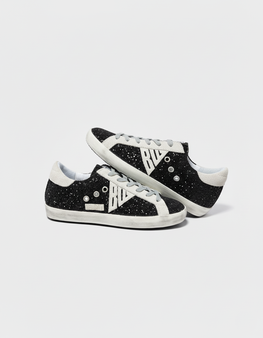 Esta zapatilla de caña baja en cuero con purpurina de color negro redefine el clásico total black con un juego de contrastes precisos: detalles en cuero beige que iluminan la silueta sin quitarle protagonismo. Sofisticada, versátil y con un diseño que equilibra carácter y minimalismo, es esa pieza que funciona con todo —pero no se parece a ninguna.