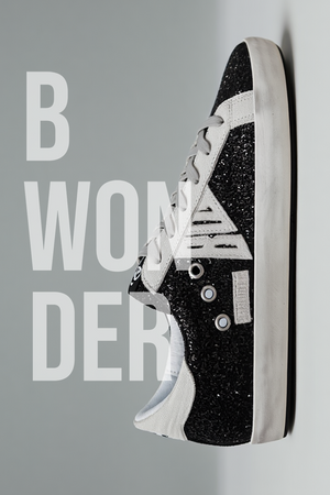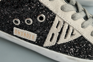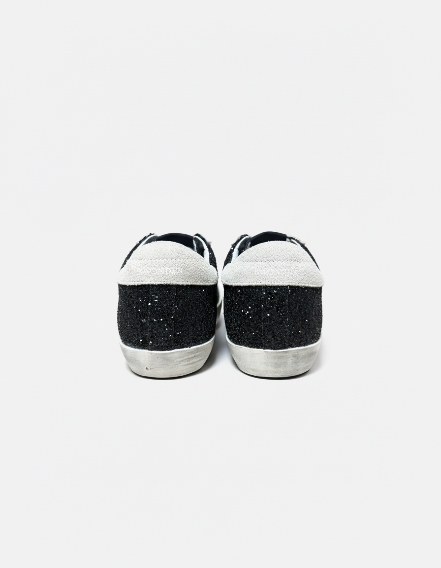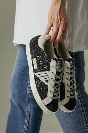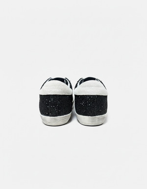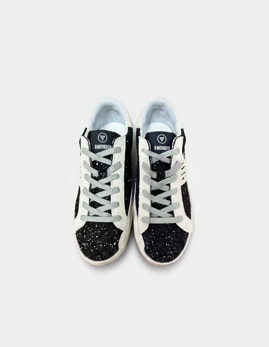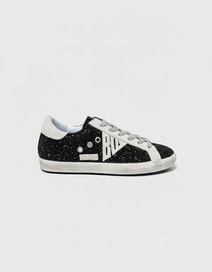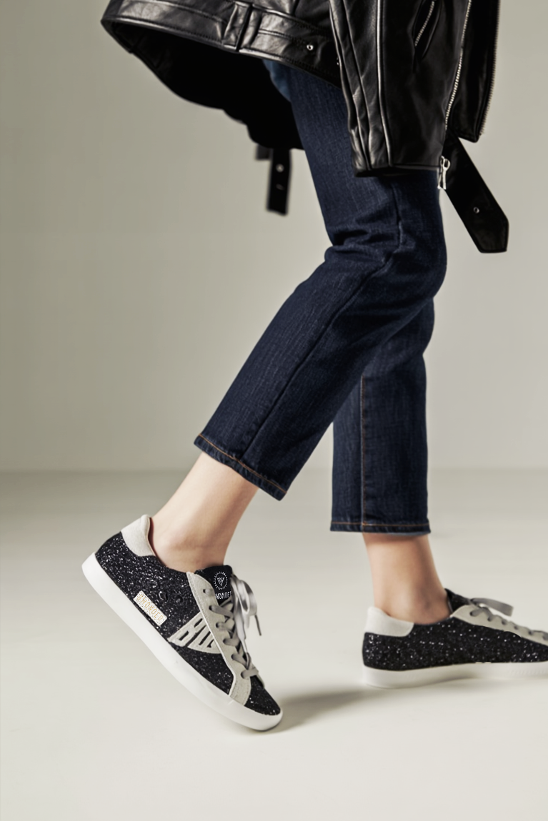 Esta zapatilla de caña baja en cuero con purpurina de color negro redefine el clásico total black con un juego de contrastes precisos: detalles en cuero beige que iluminan la silueta sin quitarle protagonismo. Sofisticada, versátil y con un diseño que equilibra carácter y minimalismo, es esa pieza que funciona con todo —pero no se parece a ninguna.