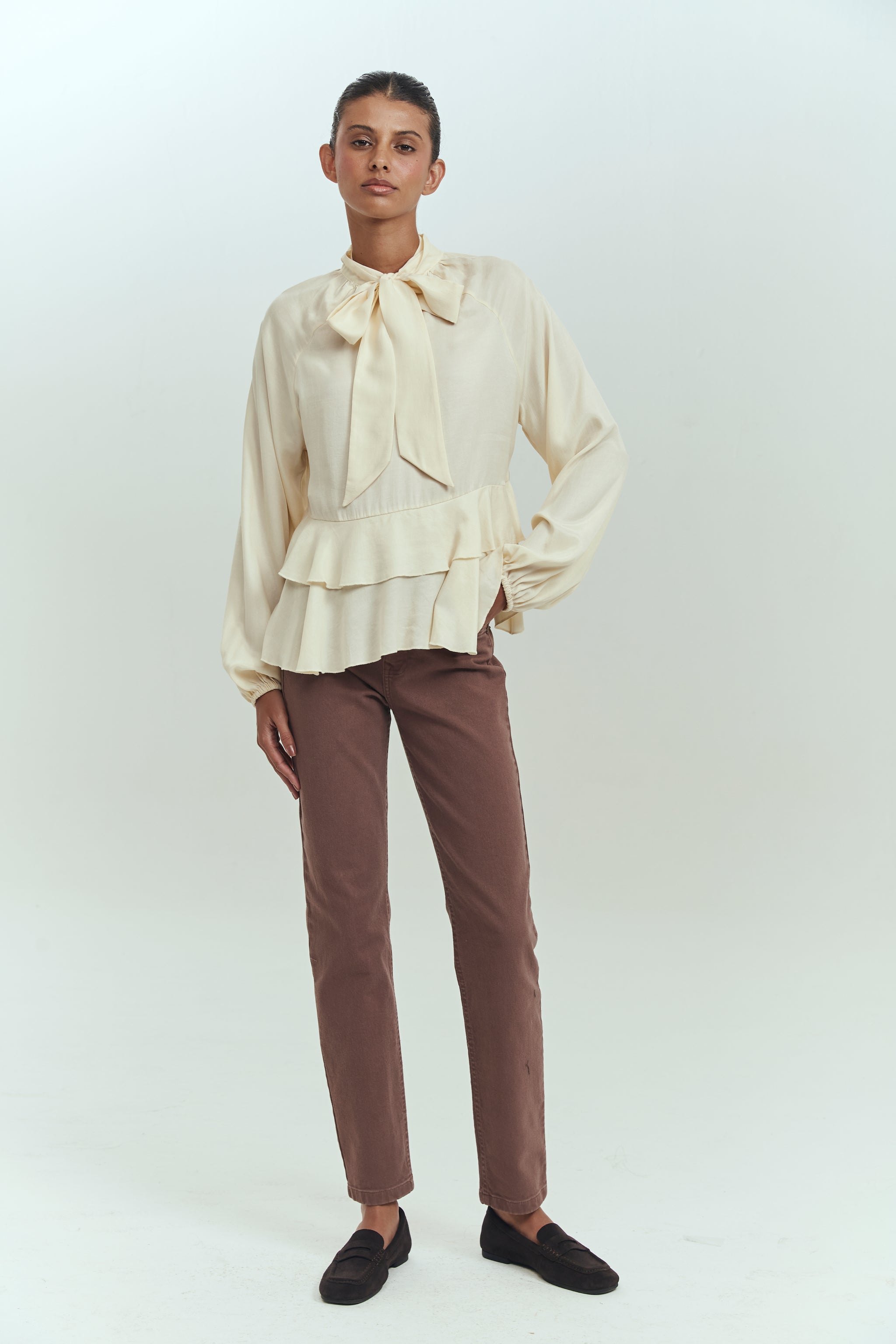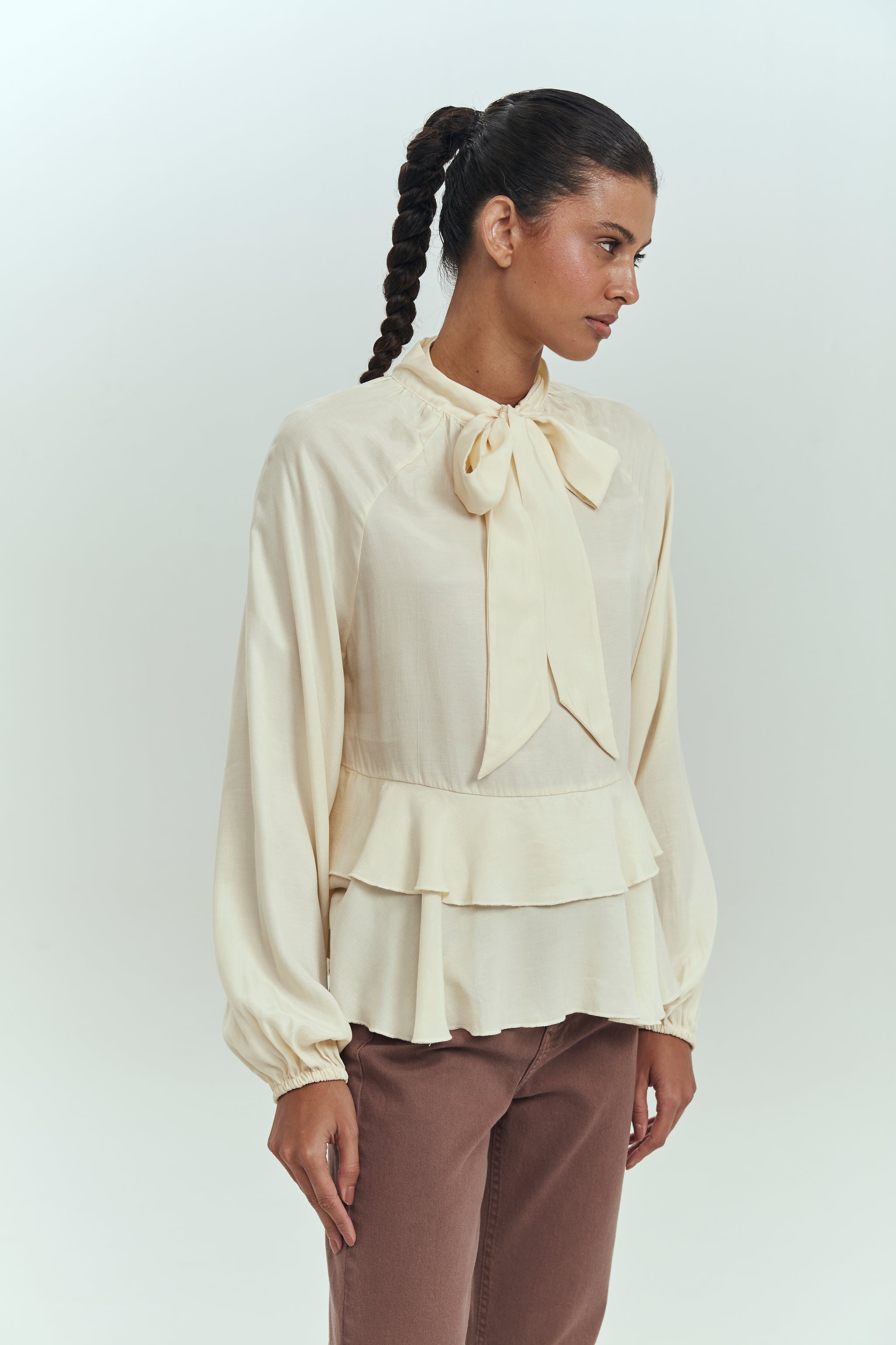 La Adele Blouse está diseñada para acompañar el movimiento con naturalidad. Su silueta de doble vuelo aporta volumen sutil y fluidez, creando una forma femenina y relajada a la vez. El lazo en el escote añade un detalle delicado y versátil: úsalo suelto para un look effortless o anudado para una terminación más pulida.