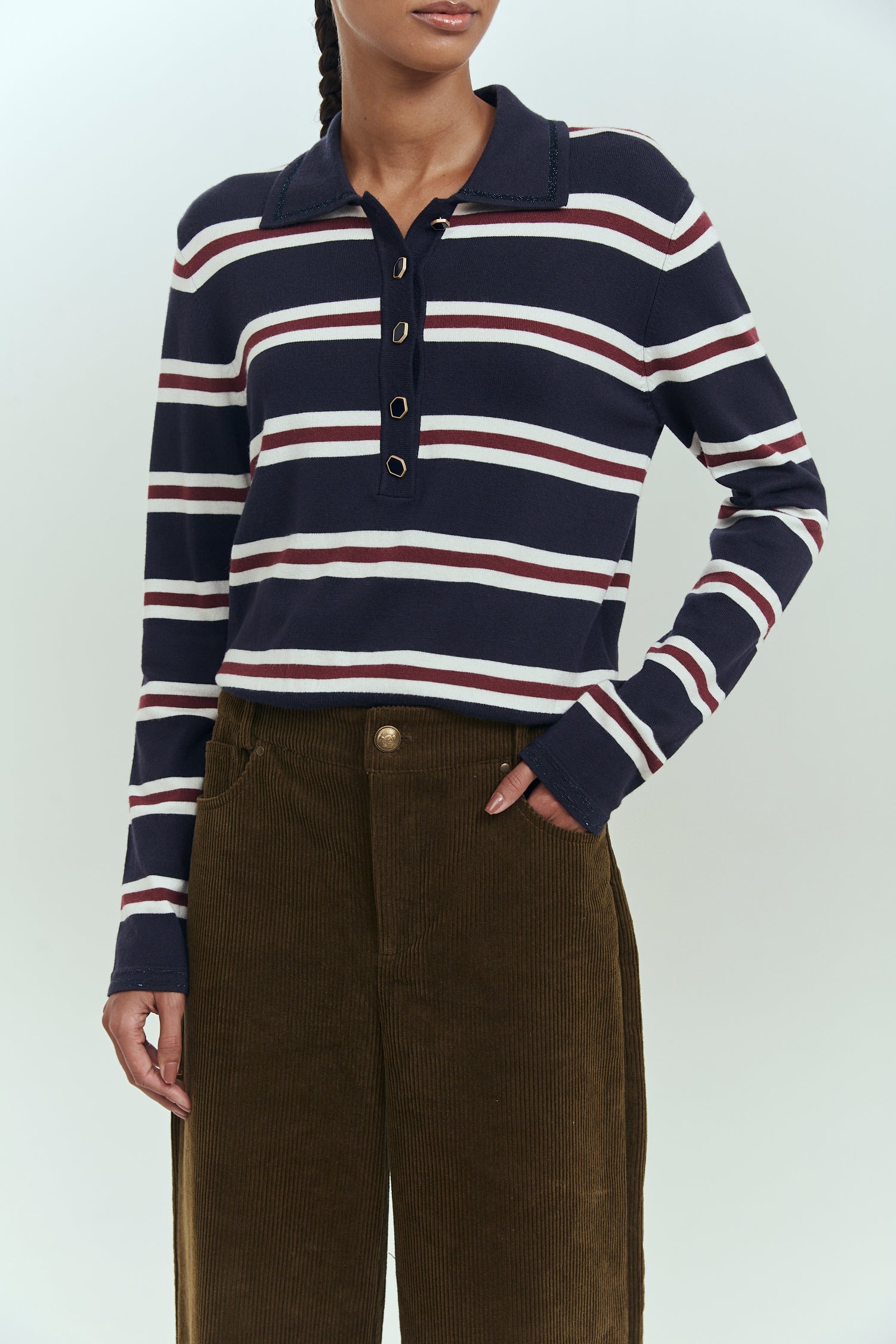 El Blur Sweater es un tejido de cuello piqué con botones, confeccionado en mezcla de nylon y viscosa que le aporta suavidad y caída. Su diseño clásico se combina con detalles sutiles en los botones, logrando un look versátil y sofisticado, ideal para outfits casuales o más arreglados.