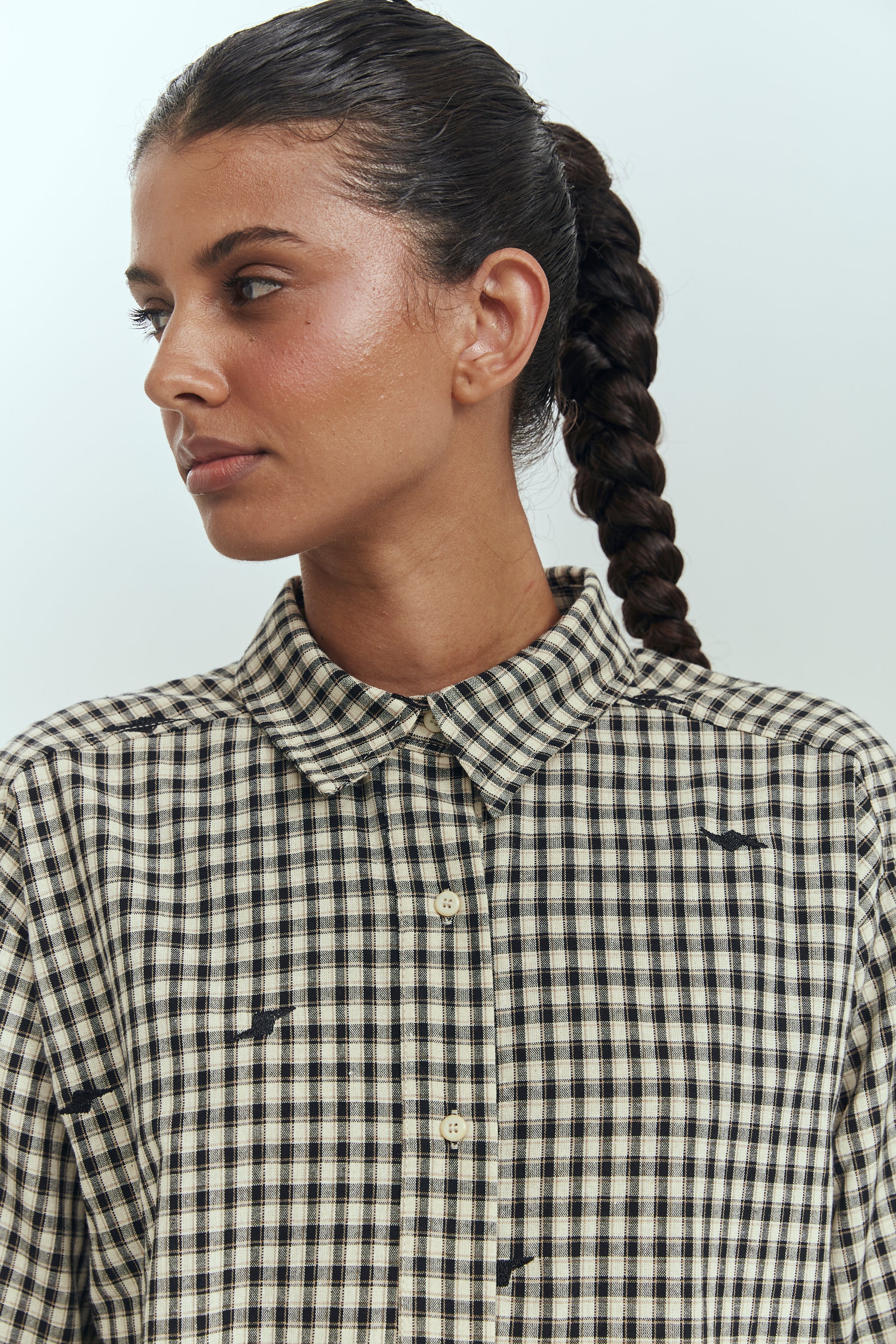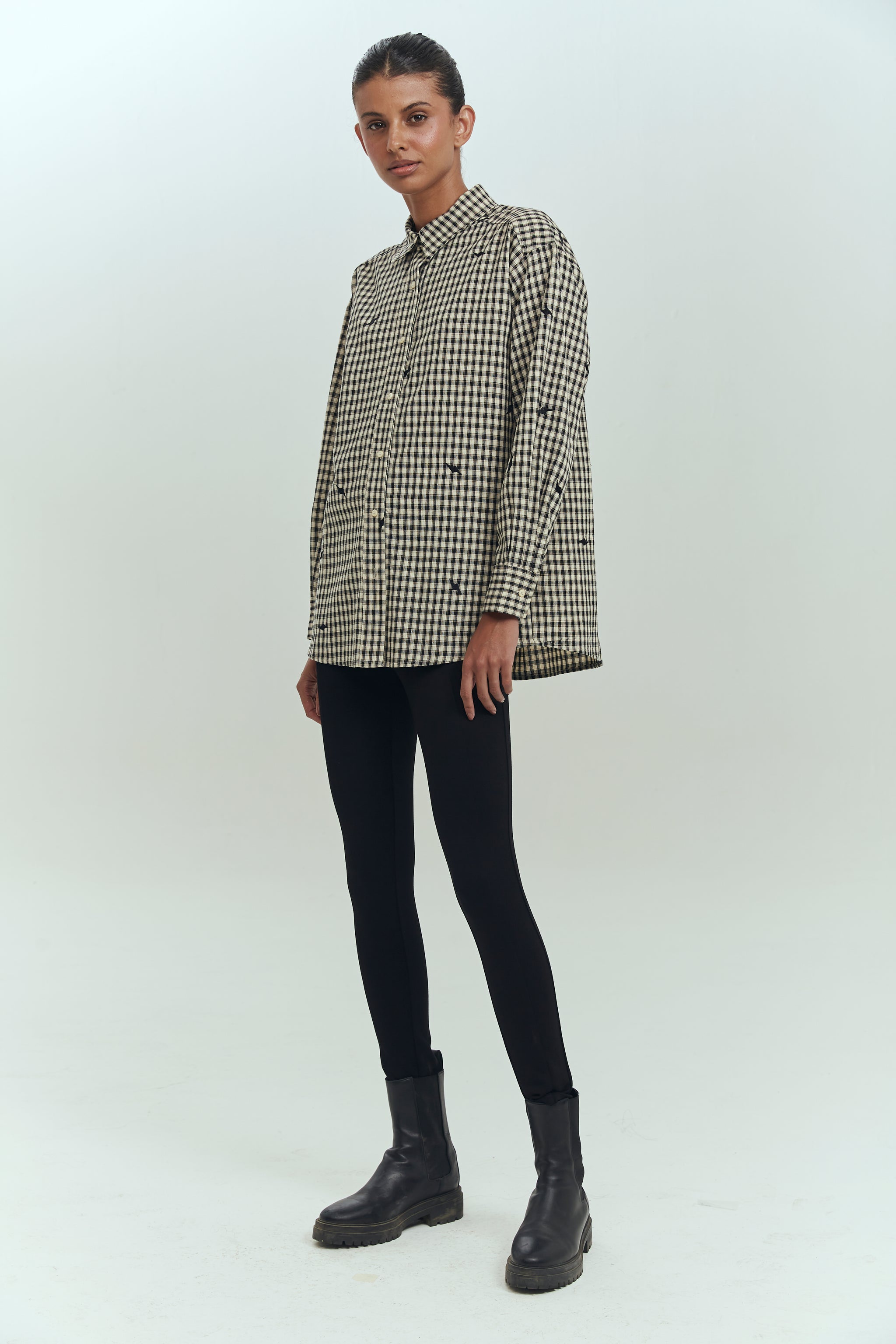 La David Blousees una blusaque destaca por si escosés en blanco y negro intervenida con rayos bordados que le da un toque edgy y moderno. Su corte tipo camisa la hace versátil y fácil de combinar.