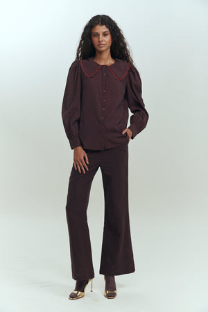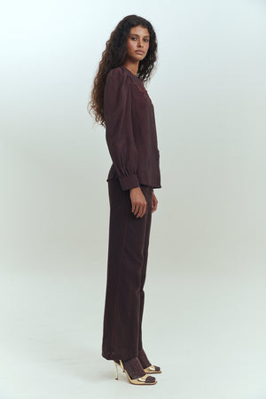 La Sophia Blouse, es una blusa manga larga de cuello bobo con elegante estampado de líneas. Comparte estampado con el pantalón Mcqueen Pants lo que hace un match perfecto para usar en set.